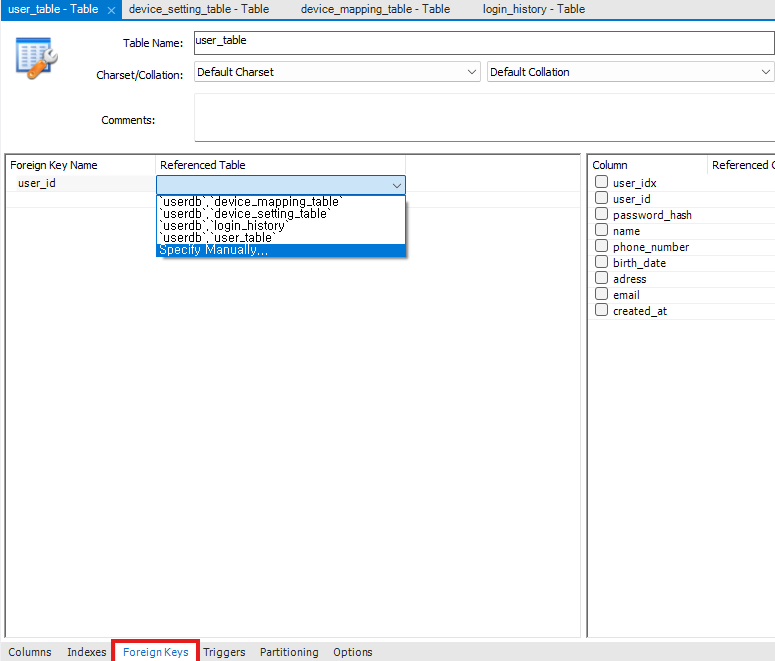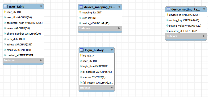 - 매핑 테이블 : 디바이스 등록을 위해 유저와 디바이스를 이어줄 테이블