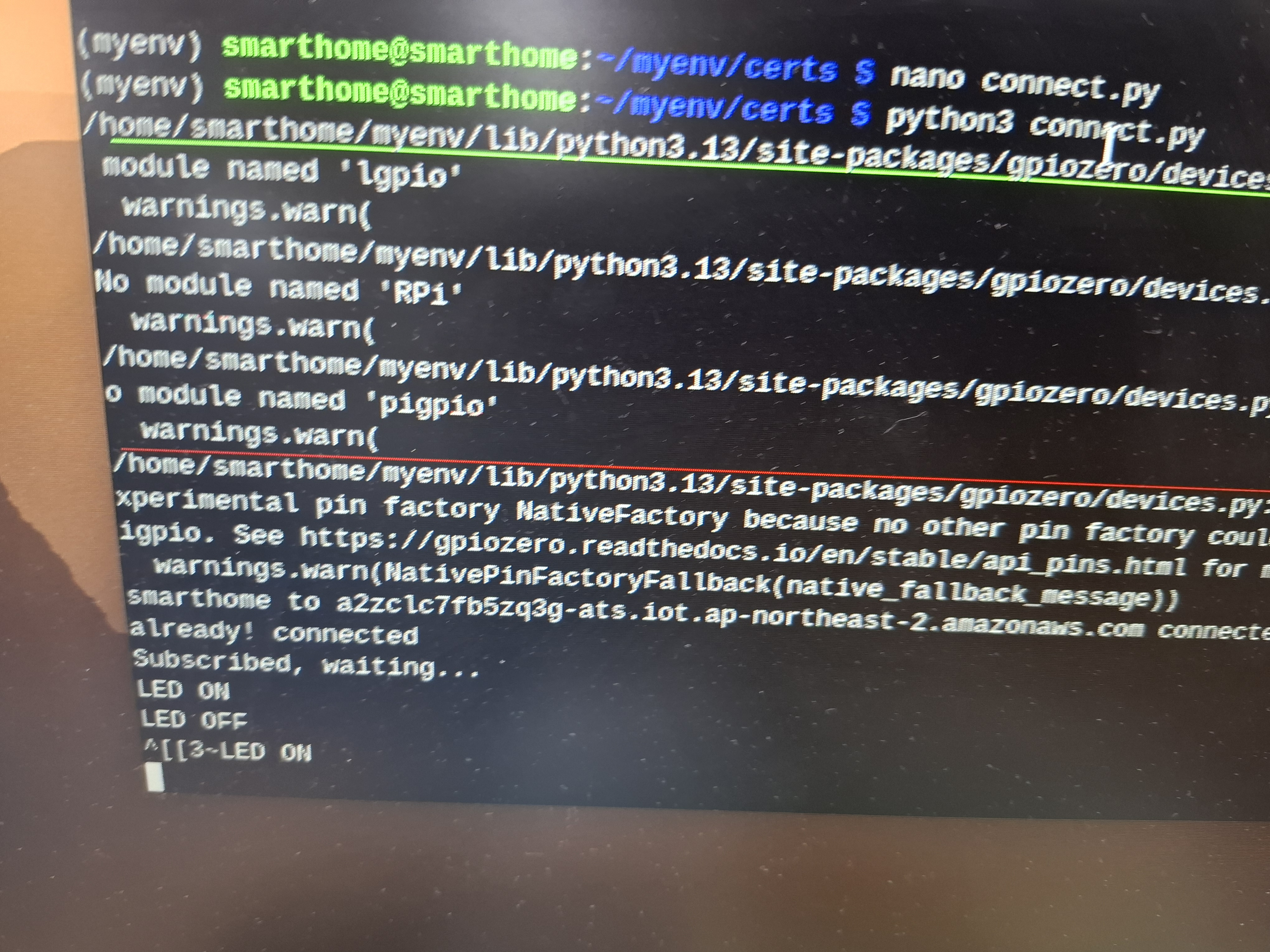 그 후에는 네트워크 설정을 하고 iot core와 연결하기 위한 기기 등록에 필요한 인증서 파일은 usb를 통해 라즈베리파이에 넘겨줬다.