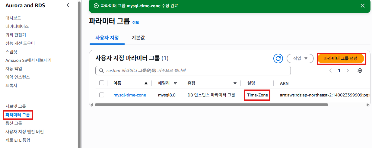 새롭게 파라미터 그룹을 만들고 time_zone 에 Asia/Seoul 로 변경한 뒤