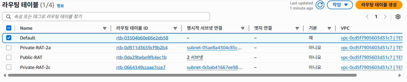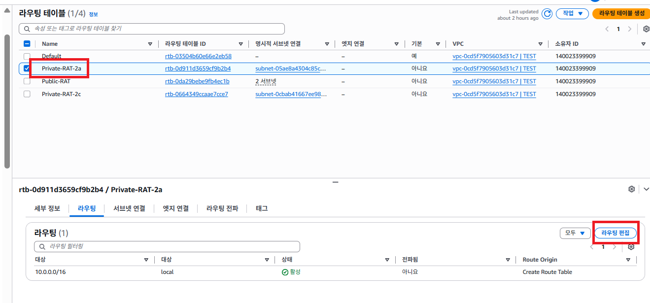 5-1. Public 라우팅 방법 (아래 사진은 Private 라우팅 테이블을 두개로 나누기 전 사진이라 한개 밖에 없음.)