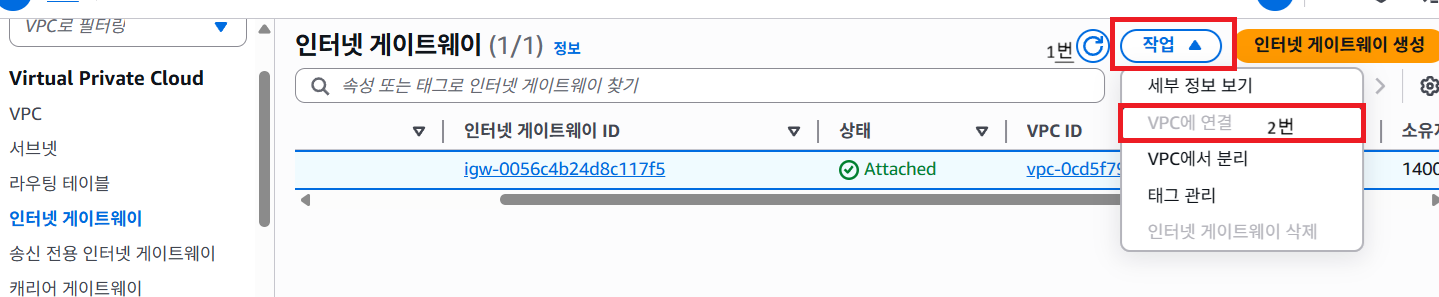 4. igw 인터넷 게이트웨이 생성 -> public 연결을 위함 -> 생성후 VPC랑 연결 (아래 사진 참고)