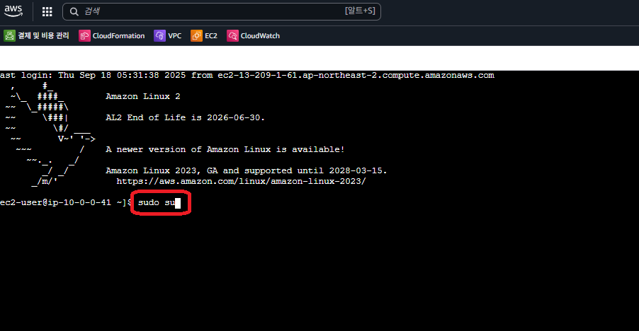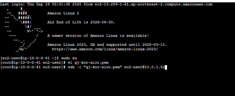 ssh -i "아까 만들었던 파일 이름" ec2-user@E2C private ip주소 입력 내 경우에는 10.0.1.52