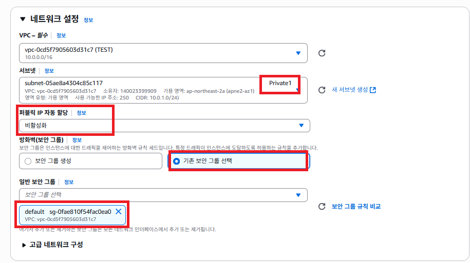 private에 E2C 만든거라 어차피 웹서버 못 띄움 퍼블릭IP 비활성하고 보안그룹도 디폴트로 생성