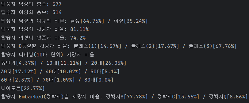 print(f"탑승자 남성과 여성의 비율: 남성[{round(((cnt_male/891)*100),2)}%] / 여성[{round(((cnt_female/891)*100),2)}%]")